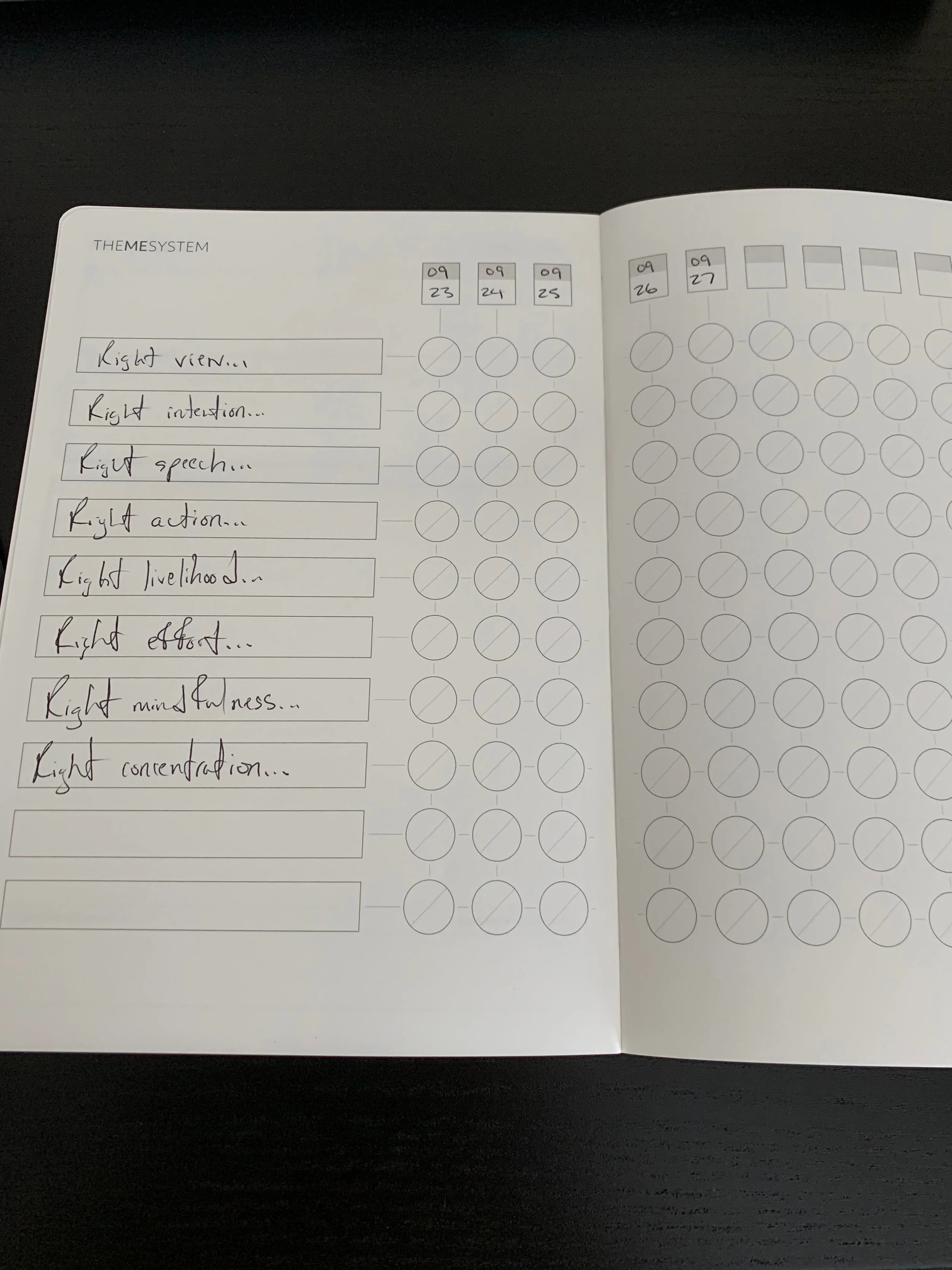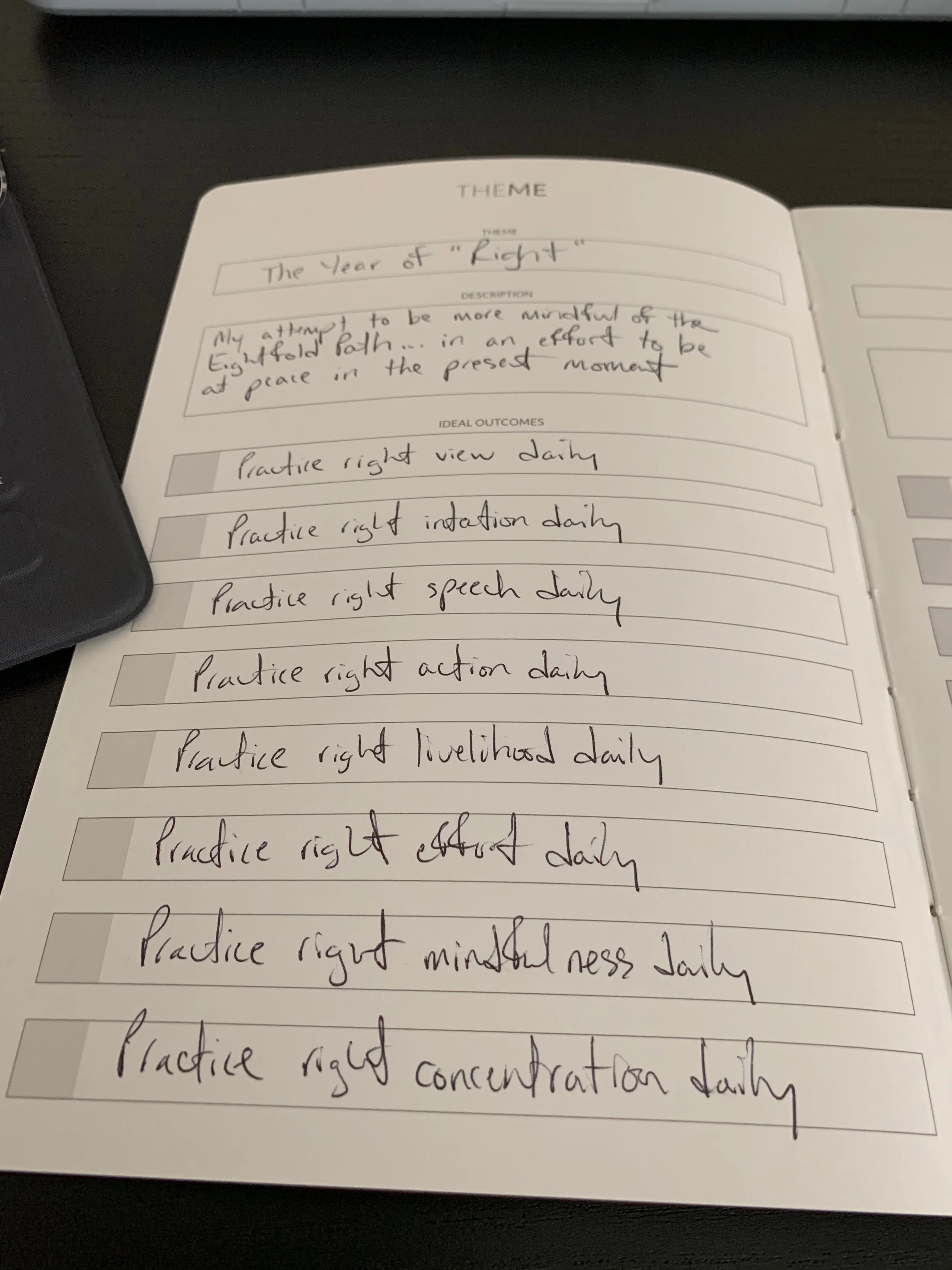 I thought I’d share how I have the journal set up as I am going to start using it this coming week. The link I provided above takes you to a webpage that Myke Hurley, creator of the journal set up for people interested in giving this a try. The webpage provides an overview of yearly themes and suggestions for how one might go about using each section of the journal.Here is a picture of the cover. It is black and soft...not leather but it feels like leather...with the Cortex symbol showing proudly.I haven’t filled in the first page which includes space to write my name, contact information and when I started the journal. I’ll get to that before Monday. I was so excited to get started I went directly to the next section titled: “Yearly Themes.” Here’s a picture of that page...As you can see there is space to write the theme, a description of the theme and what the user feels the ideal outcomes would be. If the year goes the way I am hoping...I will be practicing these things daily which should lead to more peace in the present moment.The next page I’d like to show you is in the section titled: “Journal Pages.” Here it is...There are 4 boxes of varying sizes waiting for me to write daily about things. I plan on doing this at the end of the day as a part of my daily reflective writing. Myke’s webpage has some suggestions on how to go about using this space and I am thinking of using his “Good,” “Bad,” “Proud,” and “Forward” concept. My thinking is I will be mindful of my ideal outcomes and reflect on an example for each category. Like, maybe I did something that was a “Good” example of “right effort.” If so, I would write about it. Maybe I said something that I should not have said...that would be something I could write about in the “Bad” category focusing on “right speech.”The last section of the journal is titled: “Daily Themes.” Here is what my first attempt at this is going to look like...I have my ideal outcomes written here with the dates for next week. The circles are meant to be used as a way to rank myself with an empty circle=0, 1/2 circle shaded=1/2, and a whole circle shaded=1. These “points” can be counted up for a total at the bottom of the page daily. My thinking right now is that I will start on this page then go write about why I ranked myself in the journal page section. So if I shade in “Right view” fully I could write about it in the “Good” category. If I do not shade in “Right speech” I could write about it in the “Bad” category.I’m thinking next week’s blog post will be focused on my initial thoughts about using the theme system journal for almost a week.