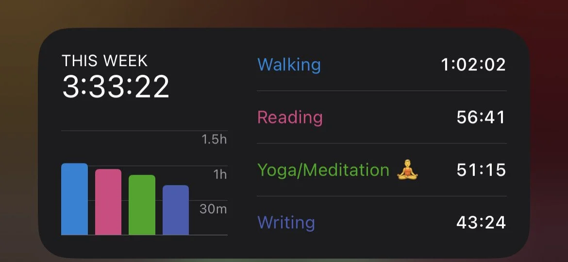 So, what I did was create a tag in Timery that I call "Domesticality" which is code for me that I am doing these things at home. I added that tag to each of my saved timers in Timery. Next, I created a report in Timery that shows me a bar graph of the time I am spending, over the course of a given week, on 6 of my daily themes; Writing, Music, Reading, Yoga/Meditation, and Walking. Finally, I created a widget on the iphone, and iPad Pro that shows me the amount of time I am spending on my daily themes I am time tracking for the current week. Here is a picture of what it looks like on my iphone...